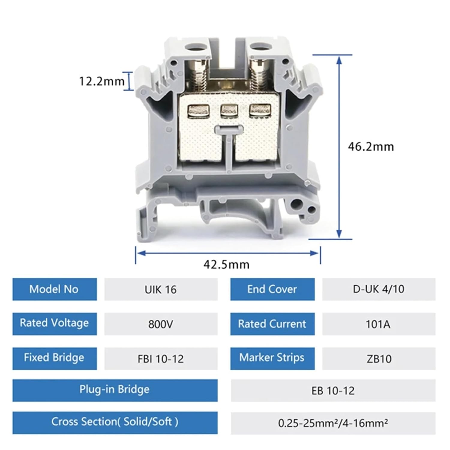 Terminal BlocksEnd coverD-UK4/10Fixed BridgeFBI10-12Insertion bridgeMarker stripZB10End stopE-UKNo ProductMarker CarrierB1/B2Marker CarrierKLM-AGrouping boardATPGround terminal blockUSLKG2.5Din RailType No.DetailsAccessoriesUIK 16800V/101A2.5-25mm2/4-16mm2L42.5/H53/W12.2 mmEnd cover:D-UK 16Fixed bridge:FBI 10-12Insertion bridge:EB 10-12Marker strip:ZB10Model NumberUIK 16Length/Height/Wide (mm)42.5/46.2/12.2Connection methodScrew connectionMaterialNylon PA66Rated Voltage/Current800V/101ACross section, solid/soft Cable2.5-25 mm2; /4-16 mm2; Conductor Size12-4 AWGMounting TypeNS 35/7.5Type No.Cross sectionsolid/soft CableVoltage/CurrentPictureClick itUK2.5B0.2-4mm²/0.2-2.5mm² L42.5/H41/W6.2 mm800V /32ABuyST2.50.2-4mm²/0.2-2.5mm² L49/H35.5/W5.2 mm800V /31ABuyPT2.50.2-4mm²/0.2-2.5mm² L48.5/H35.5/W5 mm800V /31ABuyPTTB2.50.14-4mm²/0.14-2.5mm² L68.8/H46/W5.2 mm500V /22ABuyUK5-HESIfuse holder0.2-4mm²/0.2-4mm² L73.5/H56.5/W8.2 mm800V /6.3ABuyDIKD1.50.2-4mm²/0.2-2.5mm² L73/H54.5/W6.2 mm250V /32ABuy==========Hign-concerned Chemical : NoneModel Number : UIK16Type : SpliceUsage : Distribution PanelApplication : Electrical wire conductorConnection way : ScrewMounting Type : Din RailSize L/H/W : 42.5/46.2/12.2mmCurrent : 101AVoltage : 800VCross section solid cable : 0.25-25mm2Cross section soft cable : 4-16mm2item1 : Terminal Blockitem2 : Universal Compact Wire Wiring Connectoritem3 : Din Rail Terminal Block Conductoritem4 : Screw terminal blockitem5 : Terminal eletrico