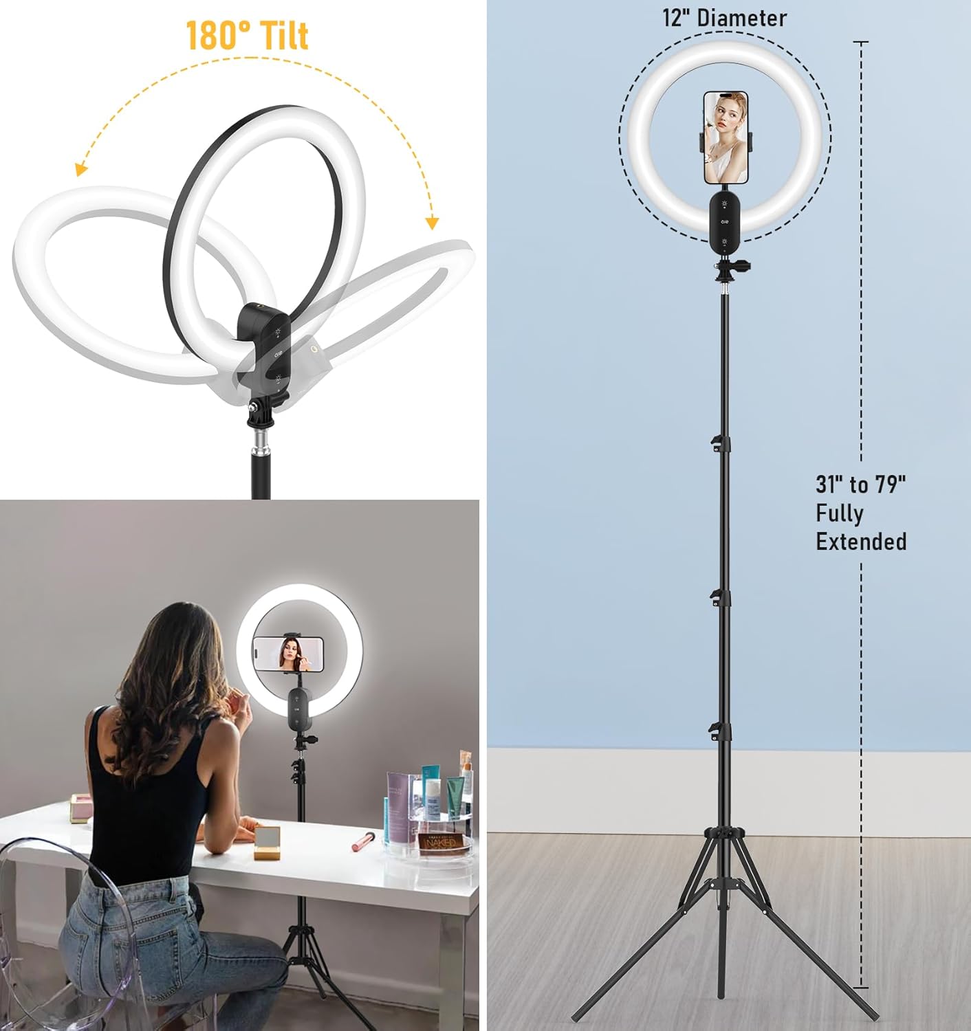 | BuiltIn Media | 1 x 12 inch selfie ring light, 1 x A/C plug adapter, 1 x User manual, 1 x remote shutter, 1 x remote controller, 1 x tripod stand, 1 x phone holder |