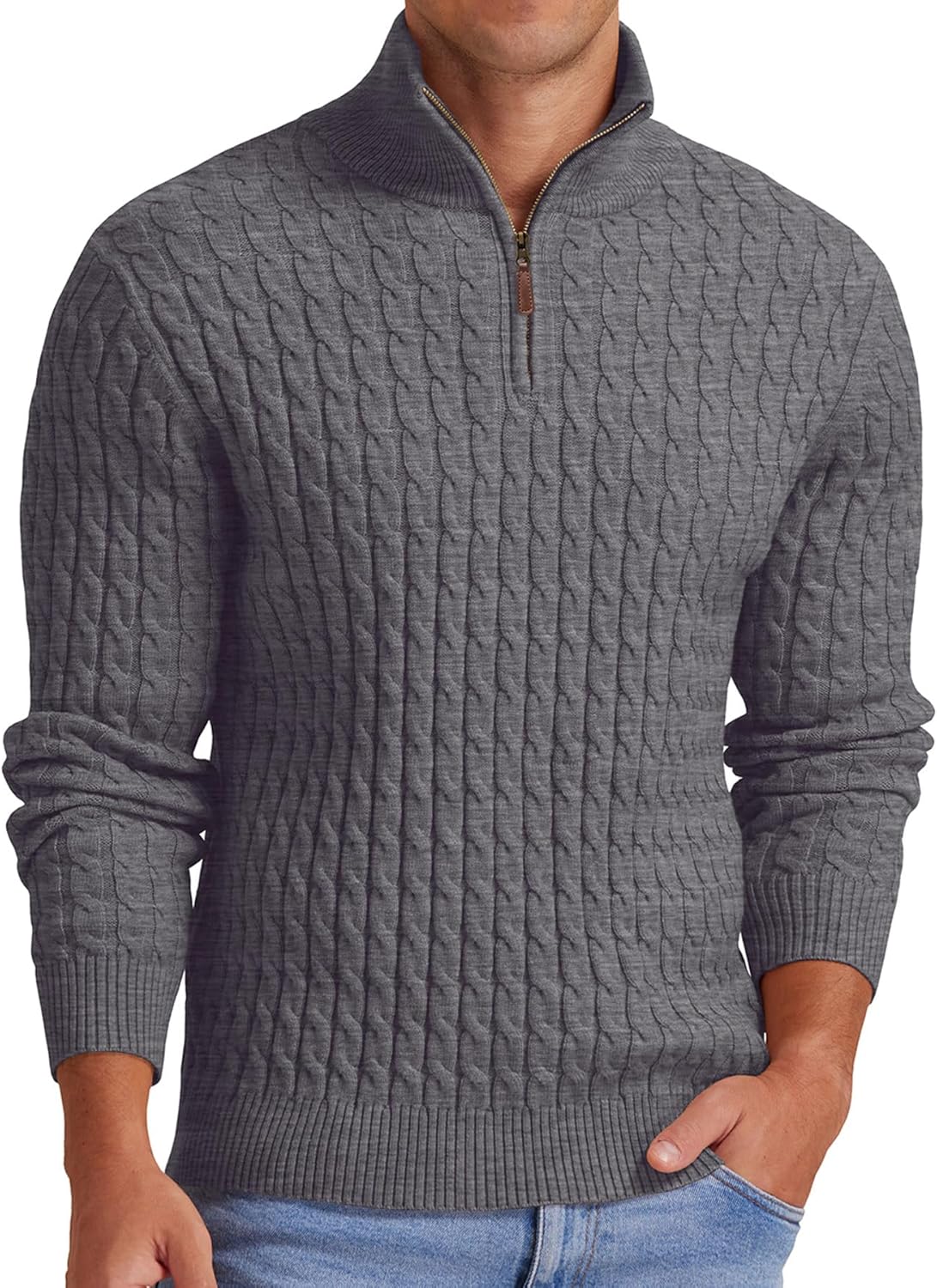Askdeer Men's Quarter Zip Sweater Cable Knit Sweater for Men Mock Neck Polo Sweater Casual Pullover Sweater Classic Zip Up Sweater with Ribbing Edg