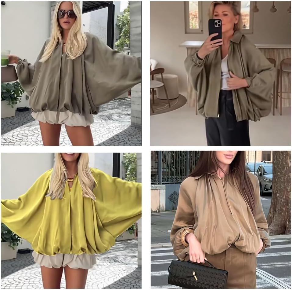 Bubble Hem Jacket, Women's Puff Sleeve Bomber Jacket, Oversized Bat Sleeve Front Zip Up Street Casual Lapel Pleated Shirts Features: 1.Exaggerated batwing sleeves ,Structured lapel collar · Modern puffed silhouette · Minimalist pleated details 2.Batwing sleeve lapel collar zip front pleated shirts adopts a turn - down collar style, with zip in the front, adding a simple touch 3.long puffed sleeves, puffed hem with pleats, lightweight bomber jacket for women Specification: Product Name: Bubble Hem Jacket Material: Polyester Placket: zipper Collar: Lapel Sleeve: Batwing sleeve Size: S,M,L Color: Army Green, Yellow, Khaki,white Package Includes: 1 pcs * Bubble Hem Jacket Note: 1.Due to the lighting effect and shooting Angle, the picture may not show the actual situation of the item, please refer to the actual product 2.Since the test conditions may be slightly different from your actual situation, please allow the effect to be slightly different, thank you for your understanding