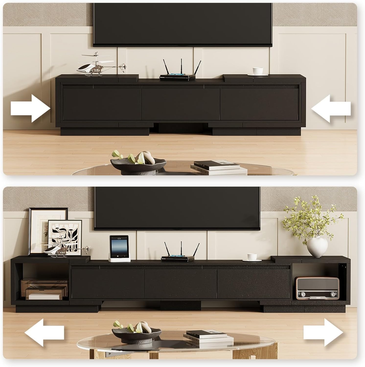 JOIKUJIA Extendable TV Stand with 3 Drawers, Modern TV Console with Hidden Handles, Contemporary Media Console Table with Open Shelves, Black 65.4”-106.3”W x 15.7”D x 15.4”H