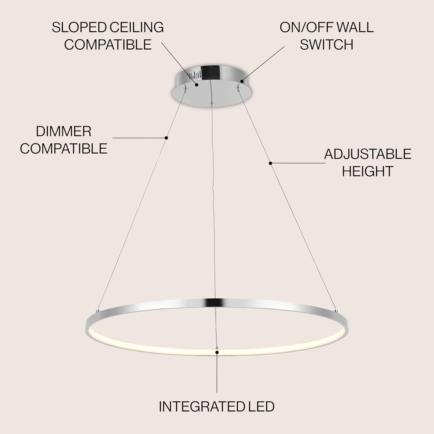 A single hoop is suspended with three wires in this modern pendant light. An integrated single-light LED lines its interior, illuminating any space with a balance of brightness and warmth. Ideal for any modern setting, it will look right-at-home over a kitchen island or dining area.
