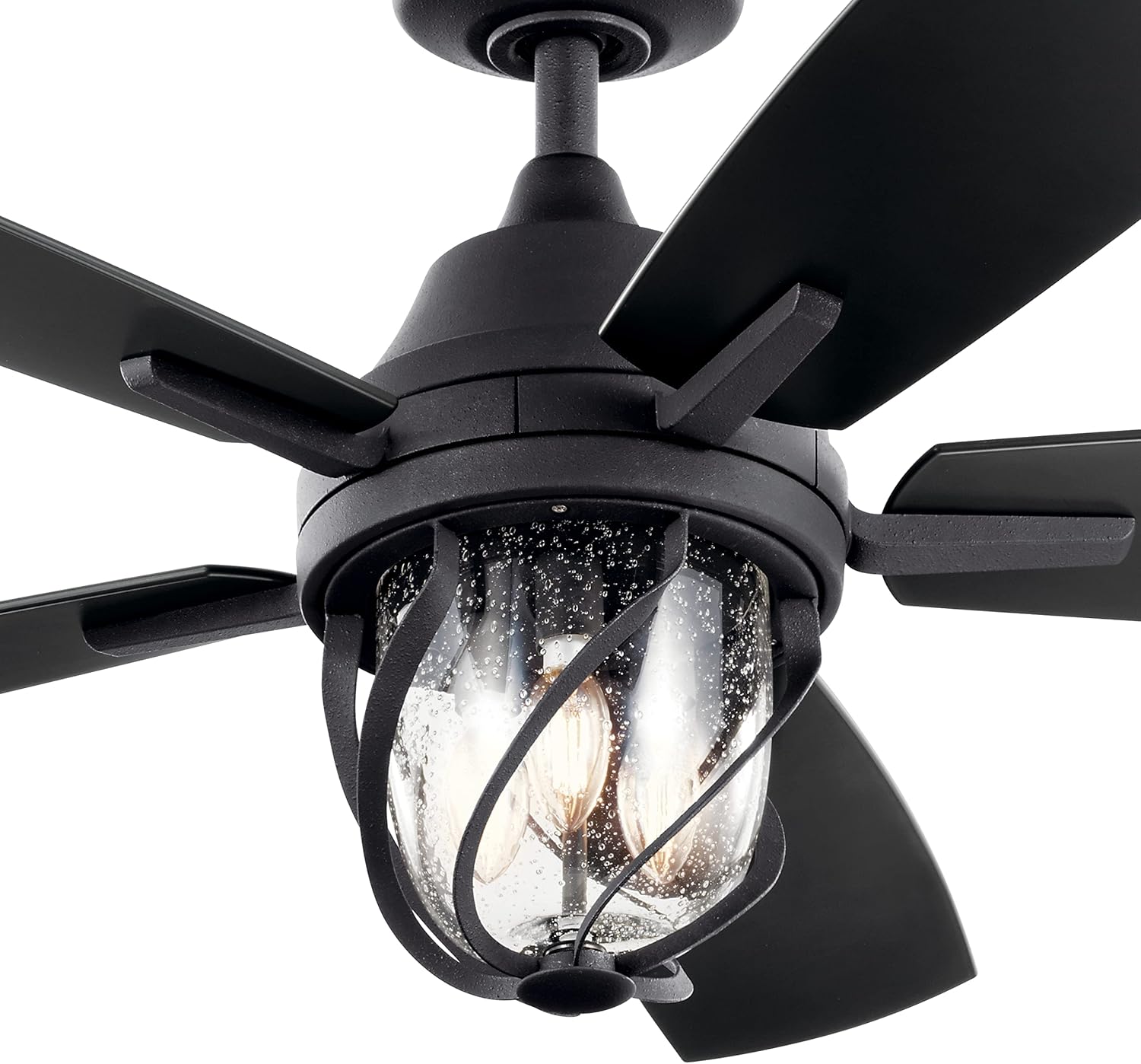 This 52 inch Lydra™ challenges the status quo as a decorative, Distressed Black steel cage twists elegantly around the Clear Seeded Glass shade and smooth curves reach to the ceiling. Its reversible blades give you the choice between a Walnut or Satin Black finish.