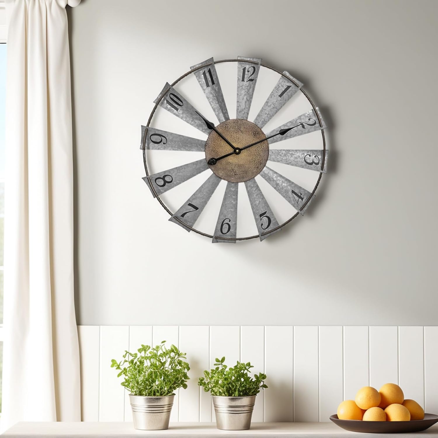 Elevate your interior with the EMAX HOME Windmill Metal Clock—a beautifully crafted large rustic clock that brings timeless farmhouse charm to any space. Inspired by classic country windmill style, this decorative wall clock blends vintage aesthetics with modern functionality. Measuring as a large rustic clock, it makes a bold yet elegant statement in your living room, kitchen, or hallway. The windmill wall clock is battery powered for hassle-free use and features easy wall mounting, allowing you to set it up in minutes. Its durable metal construction and intricate detailing reflect the essence of rustic farmhouse clock design, while the soft-tick movement ensures quiet operation. Whether you're enhancing your own home or gifting a loved one, this windmill clock rustic farmhouse clock delivers both style and practicality. Choose EMAX HOME for décor that tells time—and a story.