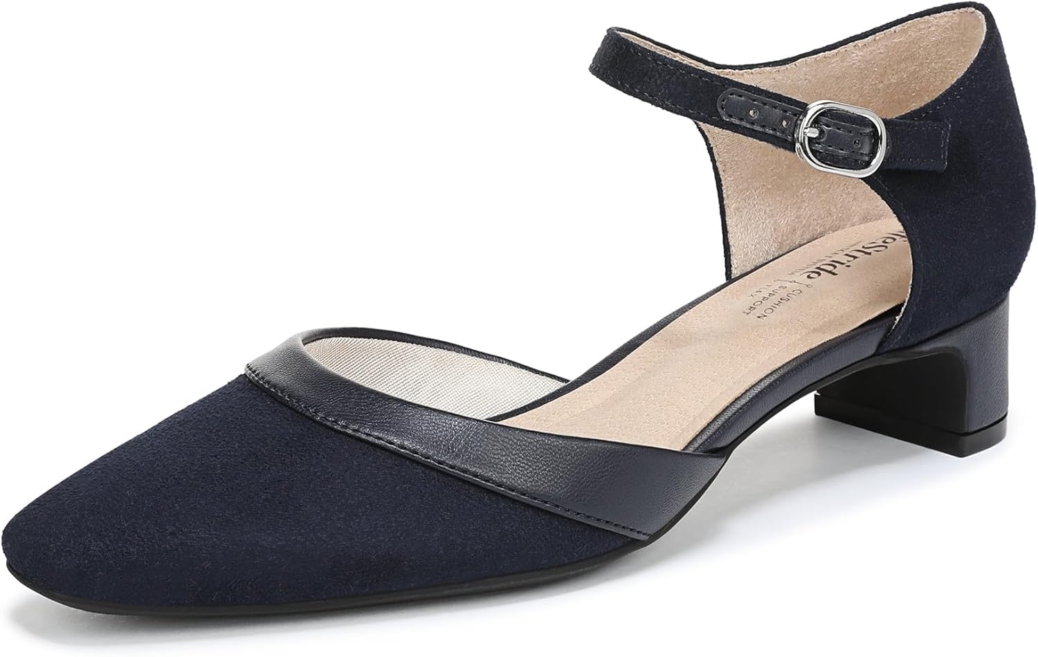Classic and comfortable, these kitten heel pumps look timeless and feel effortless all day long. Faux leather and microfiber upper with an almond toe, cupped heel, ankle strap with adjustable buckle, and enhanced comfort. Trusted Soft System® comfort technology for unmatched cushion, support, and flexibility in every pair. Traction sole provides you with extra stability. Just Right Height 1 3/8 inch block heel.