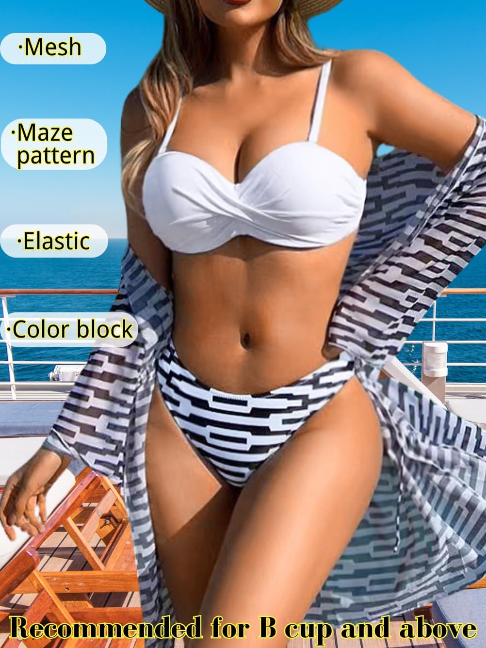 #Product's Q&A: Q: Is this material comfortable? A: Absolutely, this swimsuit is crafted from lightweight and breathable fabric, ensuring exceptional comfort and skin-friendly. Q: Will this swimsuit shrink after washing? A: No, it is designed to maintain its size and color even after washing. Q: Are the straps adjustable on this product? A: Yes, the straps are adjustable for a customized fit to suit your preference. Q: Does this product have underwire in the chest area? A: Yes, it features underwire for added support and shaping in the chest region. Q: How many items are included in the product? A: The product includes 1 set of bikini set with cover up. #Washing Guidelines: Hand wash only. Use cold water, and kindly avoid prolonged exposure to bleach.
