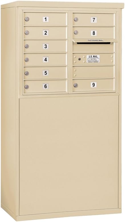 Constructed of heavy duty aluminum and stainless steel hardware, Salsbury 3900 series high security free standing 4C mailboxes can be accessed from the front through two (2) easy opening master door panels. These units provide a convenient means of installing 4C horizontal mailboxes in locations where a wall mounted application is not desired or available. The 3900 series 4C free standing mailboxes are durable and corrosion resistant that can be used indoors or outdoors and feature a powder coated finish in aluminum, bronze, gold and sandstone. All mailbox doors include a heavy-duty cam lock with a dust/rain shield and includes three (3) keys. A compartment equivalent to two (2) 3.25 in. high standard mailbox doors is used for outgoing mail collection and is labeled "Outgoing Mail". The outgoing mail compartment includes a weather protection flap, mail slot and carrier access door, which includes the U.S.P.S master lock access door (lock installed by the U.S.P.S), and anti-fish plate on rear of mail slot to prevent tampering of outgoing mail. The 4C free standing unit include a U.S.P.S. approved 4C horizontal mailbox unit and matching enclosure. Ideal for apartments, condominiums, commercial buildings, residential developments, colleges, schools, private postal centers, corporate mail centers, military bases, government agencies and many other applications. Salsbury Industries is an ISO 9001: 2015 certified company and has excelled in the field of manufacturing since 1936.