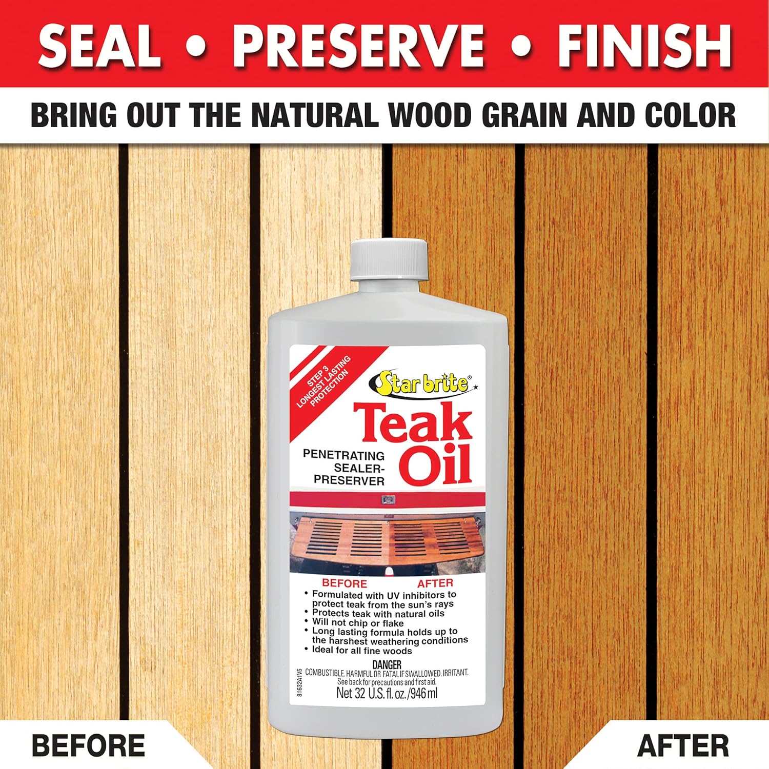 Experience the ultimate protection and enhancement for your teak and fine wood surfaces with STAR BRITE Teak Oil. This high-quality, ultra-refined teak oil is perfect for all fine woods, including acacia and Amazonia hardwood, delivering a stunning warm golden color while guarding against harsh weather, saltwater marine environments, and damaging UV rays. Ideal for boats, outdoor furniture, teak shower benches, and mats, this teak oil is your all-in-one solution for preserving and enhancing the beauty of your wood surfaces. Its advanced formula of polymers and tung oil blend provides extended protection that outlasts basic teak oils by up to 6 times. The easy application process and added UV protection make STAR BRITE the go-to solution for wood care. Apply additional coats to achieve the desired level of shine. Pre-treatment with STAR BRITE Teak Cleaner and Brightener is needed for optimal results. Experience the long-lasting beauty and protection of STAR BRITE Teak Oil. DIRECTIONS: If the wood is dirty or weathered, first treat with STAR BRITE Premium Teak Cleaner and STAR BRITE Premium Teak Brightener. Apply to dry surface using a brush or cloth in the direction of the wood grain. Allow to soak into wood, then wipe off excess. Apply second coat if necessary. Re-apply STAR BRITE Teak Oil at first sign of weathering.