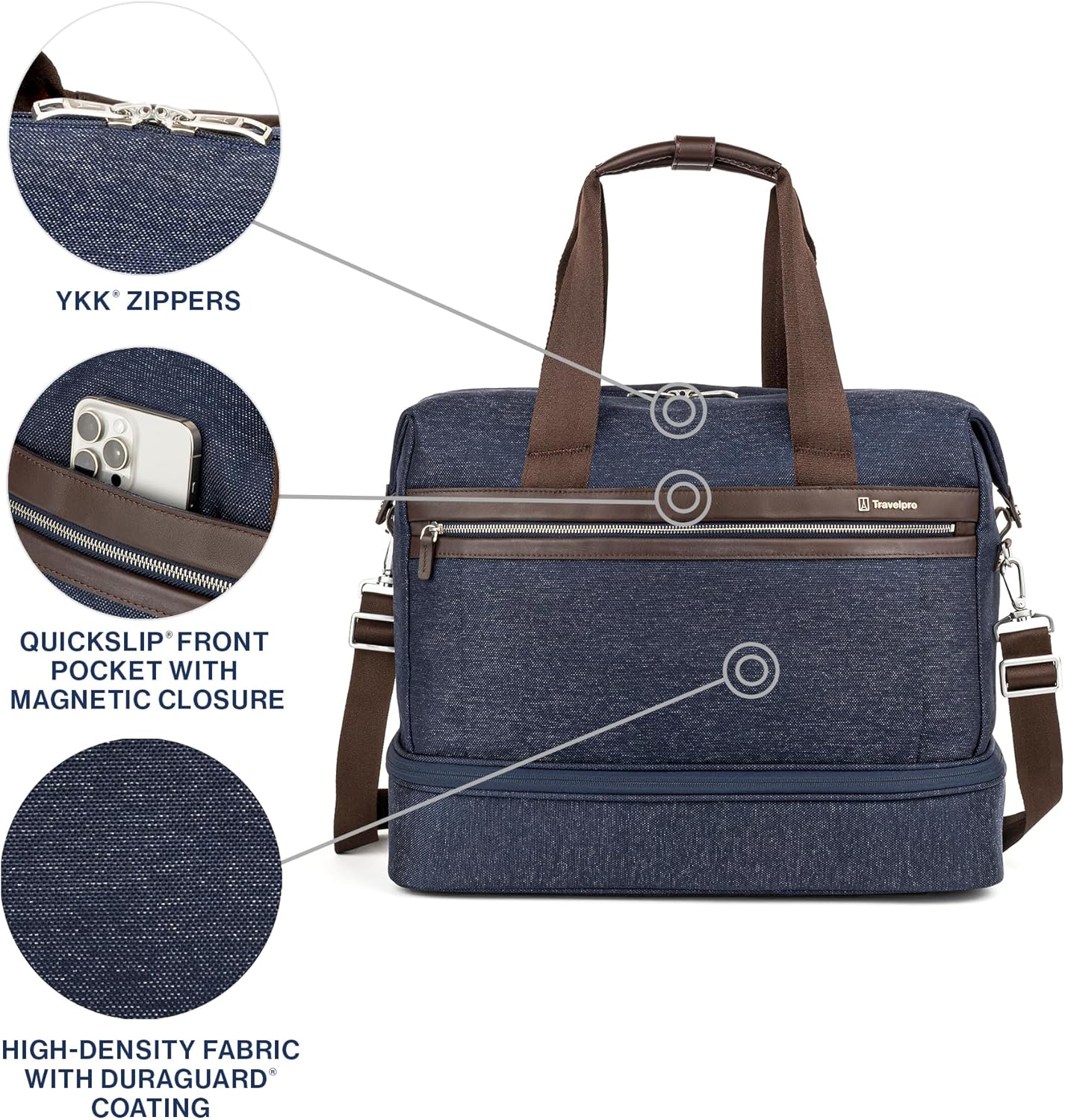 Designed for impressive adaptability with a removable bottom compartment, the Travelpro Platinum Elite Drop-Bottom Weekender makes an excellent gym bag, around-town commuter satchel, and an all-in-one travel carry-on. Fit for far more than weekends, this stylish and durable do-all features a bottom section with a divider panel that can be used to separate shoes or other items from the main compartment or opened to create a larger single interior space. For ultimate convenience, remove the bottom completely to create a smaller bag when needed. Keeping everything organized, an interior padded sleeve protects electronics, and a Travelpro QuickSlip front pocket securely stores a cell phone or other often used item. ECOFAB interior lining is easy to keep clean and made from recycled plastic bottles, while the ultra-durable, high-density exterior fabric is treated to resist stains and abrasions and then finished with full-grain leather details and hardy YKK® zippers for extreme resilience. Carrying options include leather handle touchpoints, a removable, adjustable shoulder strap, and an integrated rear strap that slides over the extension handle of a rolling suitcase for secure stacking.