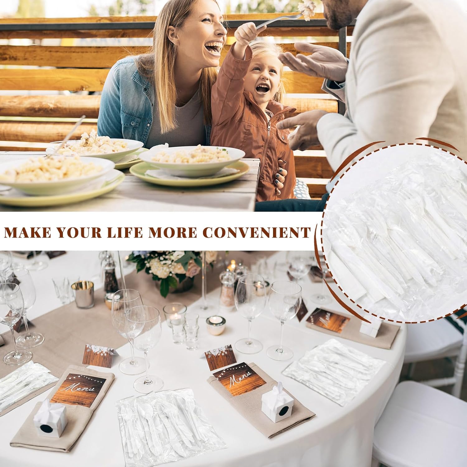 Features: The plasticware is disposable, making cleanup a breeze. After use, simply toss the utensils and napkins into the bin, saving you time and effort in washing and drying. This feature is convenient for large gatherings and events where convenience is key. The disposable silverware set is designed with proper size. The knives measure about 6.61 x 0.87 inches/ 168 x 22 mm, forks measure about 6.1 x 0.98 inches/ 155 x 25 mm, and spoons measure about 5.83 x 1.3 inches/ 148 x 33 mm. The proper size ensures a comfortable grip and smooth eating experience for your guests. Specifications: Main materials: PP plastic, paper Color: white Size: Knives: about 6.61 x 0.87 inches/ 168 x 22 mm Forks: about 6.1 x 0.98 inches/ 155 x 25 mm Spoons: about 5.83 x 1.3 inches/ 148 x 33 mm Napkins: about 8.66 x 8.66 inches/ 220 x 220 mm when unfold Package includes: 200 x Knives 200 x Forks 200 x Spoons 200 x Napkins Notes: Manual measurement, please allow slight errors on size. The color may exist a slight difference due to different screen displays. Pointed items are included, it is recommended to keep them away from kids