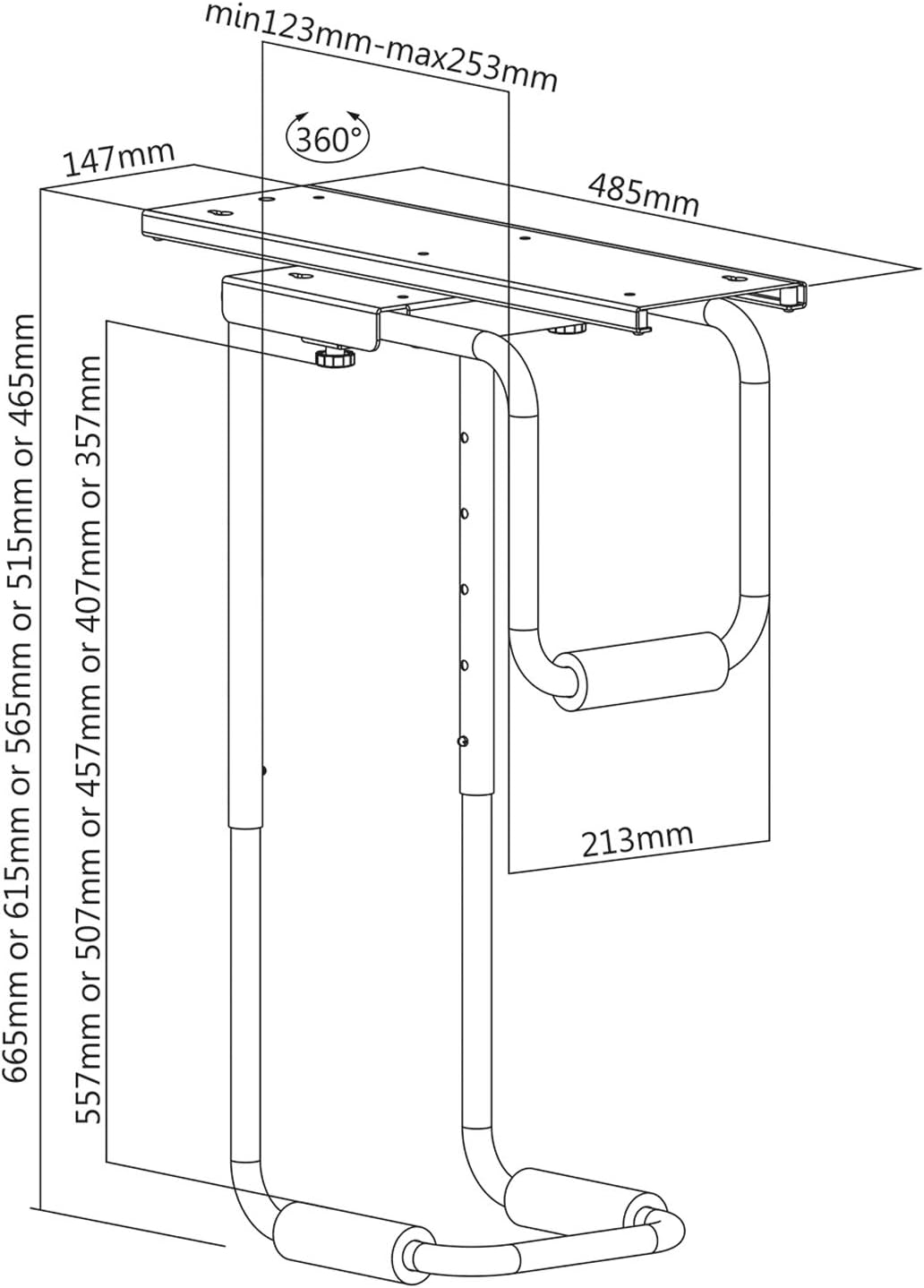 Sturdy PC holder for under desk mounting for more space on your work table, adjustable in height and width - for secure fixing of the PC - and rotates 360°. Space-saving PC holder, so you have more space on your work table. Sturdy steel tube. construction construction can be rotated up to 180° to the right or left, extendable up to 13 cm. Attaches under the table top (min. 15 mm), screws not included. Load capacity: 30 kg. Height adjustable in steps: 357 / 457 / 507 / 557 mm. Adjustable width: 123 - 253 mm. Extendible length: yes. Rotating: 360°