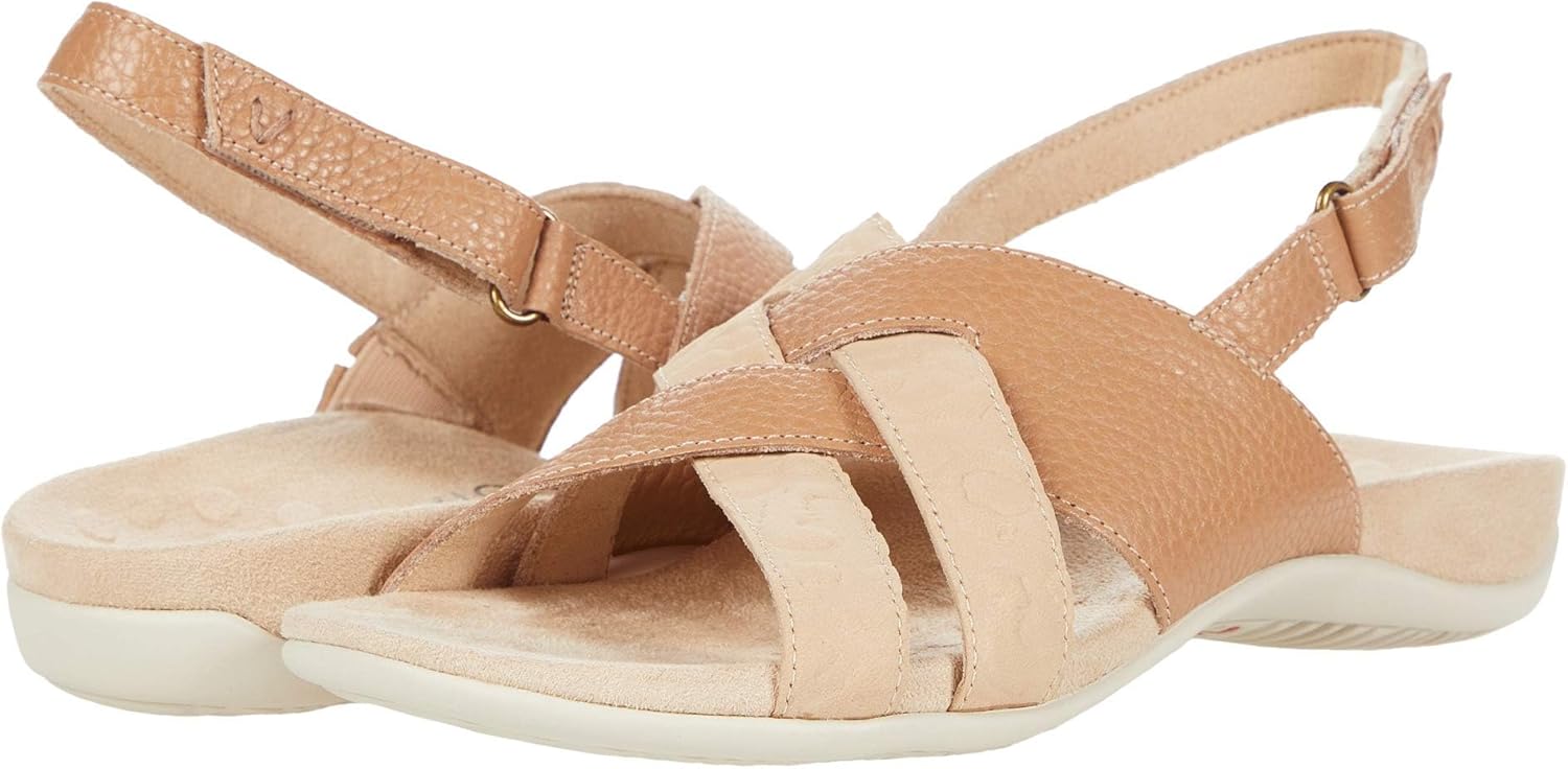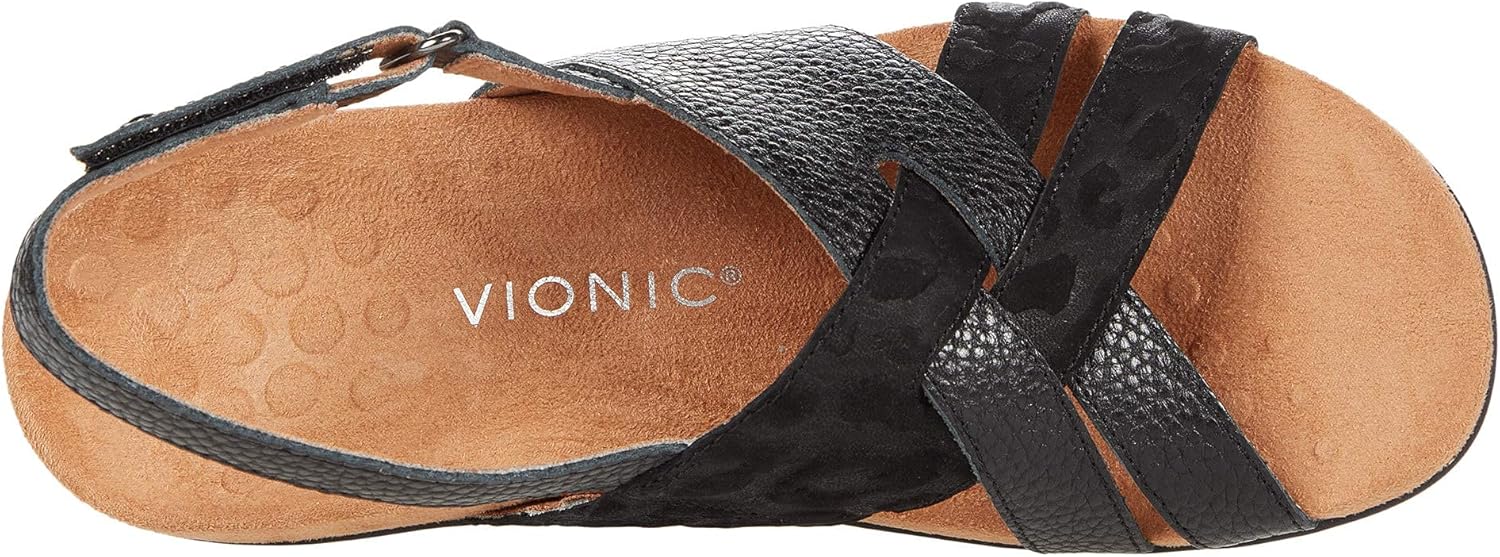 Vionic Eira Women's Backstrap Sandal. Subtle animal print overlaps with subtle pebble texture on this strappy, hook/loop-closure leather sandal. Slightly wide sizing. Vionic footwear is stylish and comfortable and incorporates a podiatrist designed biomechanical footbed for support.