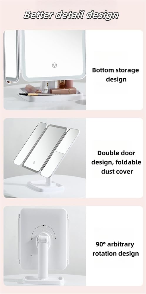 Elevate your daily routine with our premium Magnifying Makeup Mirror. Designed for precision and convenience, this mirror features dual reflective surfaces: a standard 1X view for overall application and a powerful 10X magnification side for intricate detail work. The integrated LED lighting system provides bright, shadow-free illumination essential for flawless results.Choose the perfect lighting ambiance with three distinct color temperature settings: Warm White for a relaxing glow, Cool White for high-contrast definition, and Natural Daylight for true-to-life color accuracy. Adjustable brightness levels let you fine-tune the light intensity to suit your environment and needs.Built with stability in mind, the mirror features a substantial, weighted base with a non-slip surface. This ensures it stays firmly positioned on your countertop, providing a safe and reliable experience every time you use it.Invest in a mirror that combines clarity, intelligent lighting, touch-free operation, and secure design – the perfect addition to your beauty and grooming arsenal.Product Specification:Dimensions: 41cm x 31 cmMagnification: 3x magnificationPower supply: USBColour: black, whiteColour temperature: Warm colours, cool colours, natural lightMaterial: ABS and glassYou will receive1* Lighted Makeup Mirror1* Base1* User ManualIf you have any questions about our products, please feel free to contact us. We will provide you with 24-hour online customer service.