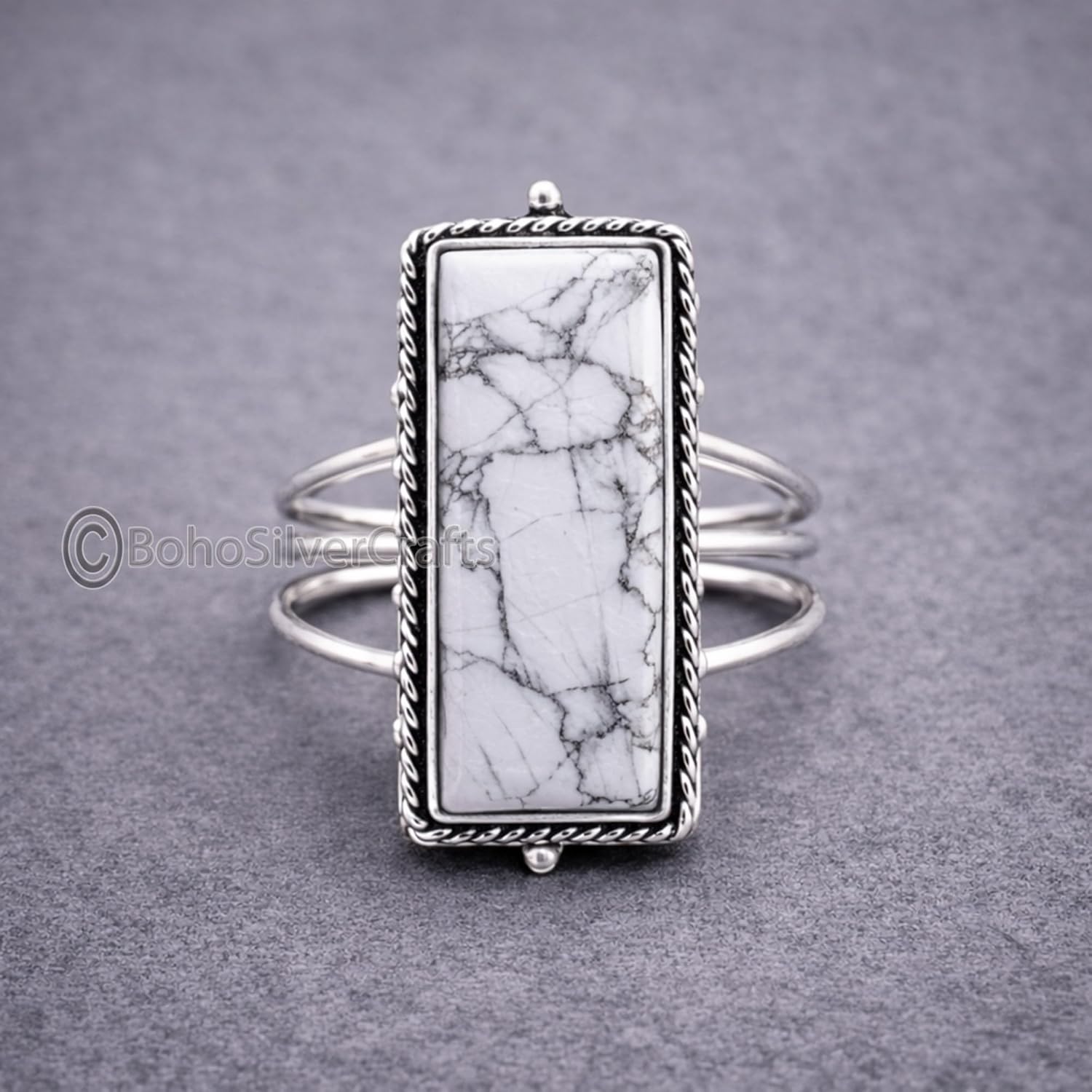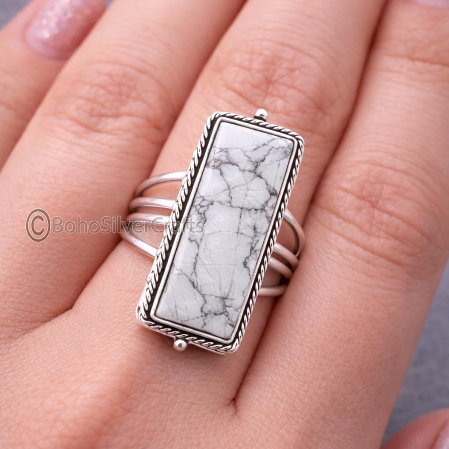 White Howlite Rectangle Gemstone Triple Band Style Ring – 925 Sterling Silver Handmade Jewelry Enhance your jewelry collection with the serene beauty of this White Howlite Rectangle Gemstone Triple Band Style Ring, expertly handcrafted in premium 925 sterling silver. The natural white howlite gemstone features soft gray veining, offering a clean, elegant, and calming appearance. The rectangle-cut stone paired with a modern triple band style creates a bold yet graceful statement. Designed for comfort and everyday elegance, this ring complements both casual and formal outfits beautifully. Each ring is individually handmade by skilled artisans, ensuring fine craftsmanship and a unique finish. Whether worn as a personal style accessory or gifted to someone special, this ring symbolizes peace, elegance, and timeless sophistication. Perfect for birthdays, anniversaries, Valentine’s Day, Mother’s Day, or any meaningful celebration.