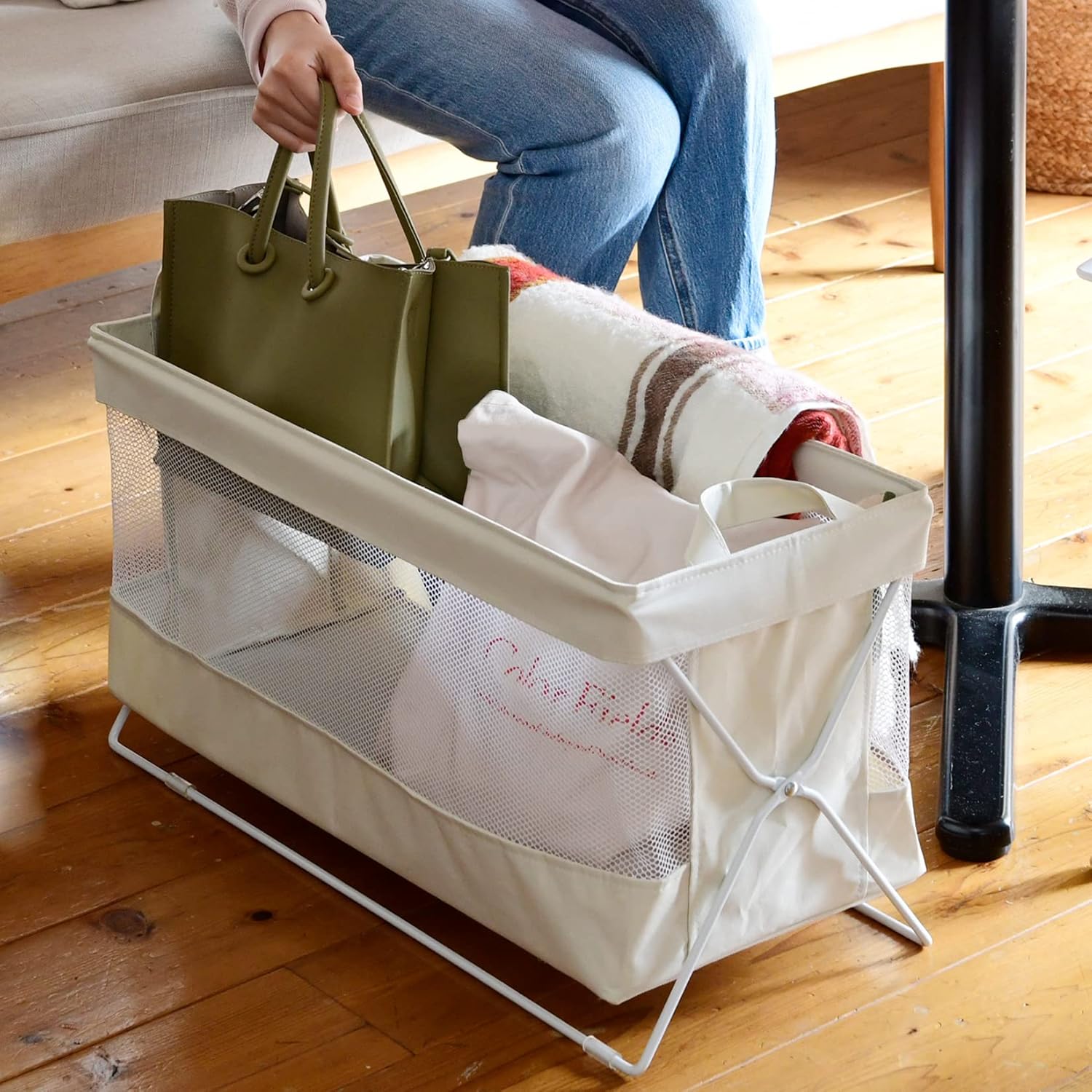 A box that allows you to place your bag or luggage directly on the floor. Can be folded for compact storage. The basket part and frame are separated, and the handle can be carried around. See-through mesh for easy identification of contents.
